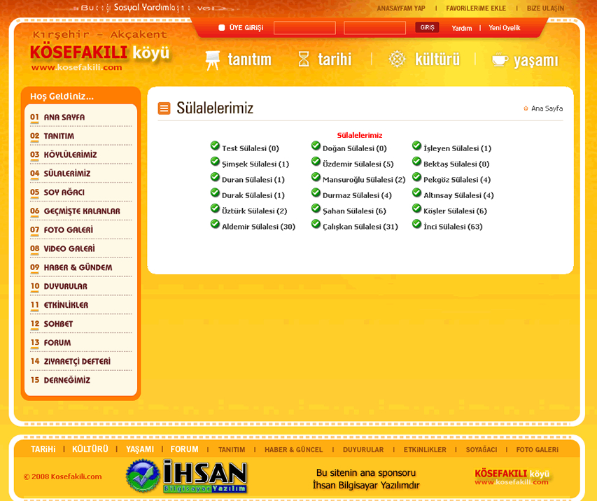 sayfasında köye ait tüm sülaleler listelenir.Sülale isimlerinin yanında o sülaleye mensup köylü sayısını da görebilirsiniz